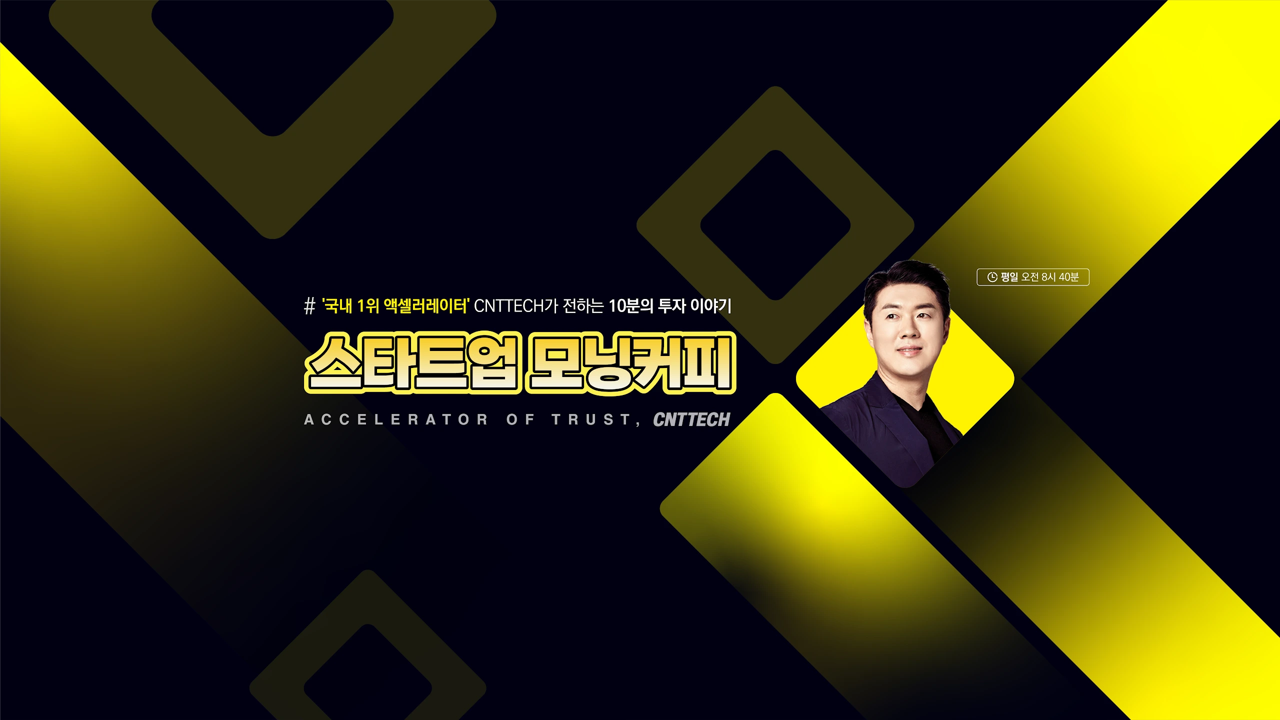 씨엔티테크(CNTTECH)의 공식 유투브 채널 '전화성의 CNTV'를 소개합니다. 씨엔티테크는 전화성 대표가 창업자로 2003년에 설립한 소프트웨어 플랫폼 회사이면서 동시에 2012년부터 엑셀러레이터로서 공격적인 투자를 진행하고 있습니다. 현재 500개가 넘는 투자 포트폴리오를 기반으로 연 200억원 규모의 투자를 진행하는 탑티어 액셀러레이터입니다. CNTV의 의미는 'CNT가 투자하면 V 승리한다'라는 의미와 'CNT의 TV'라는 중의적인 의미를 가지고 있습니다. 본 채널은 4개의 주요 프로그램으로 구성됩니다. 1. 스타트업 모닝커피 (생방송) CNTV의 메인 프로그램입니다. 평일 오전 8시반 생방송으로 매일 '스타트업 뉴스/동향'와 '유망스타트업 분석' 시간으로 이루어 집니다. 스타트업 뉴스는 플래텀(Platum)과 제휴로 정보가 제공됩니다. 유망스타트업 분석은 씨엔티테크의 포트폴리오 스타트업들을 소개하고 후속 투자를 위한 사전 IR 성격을 띱니다. 2. 전화성