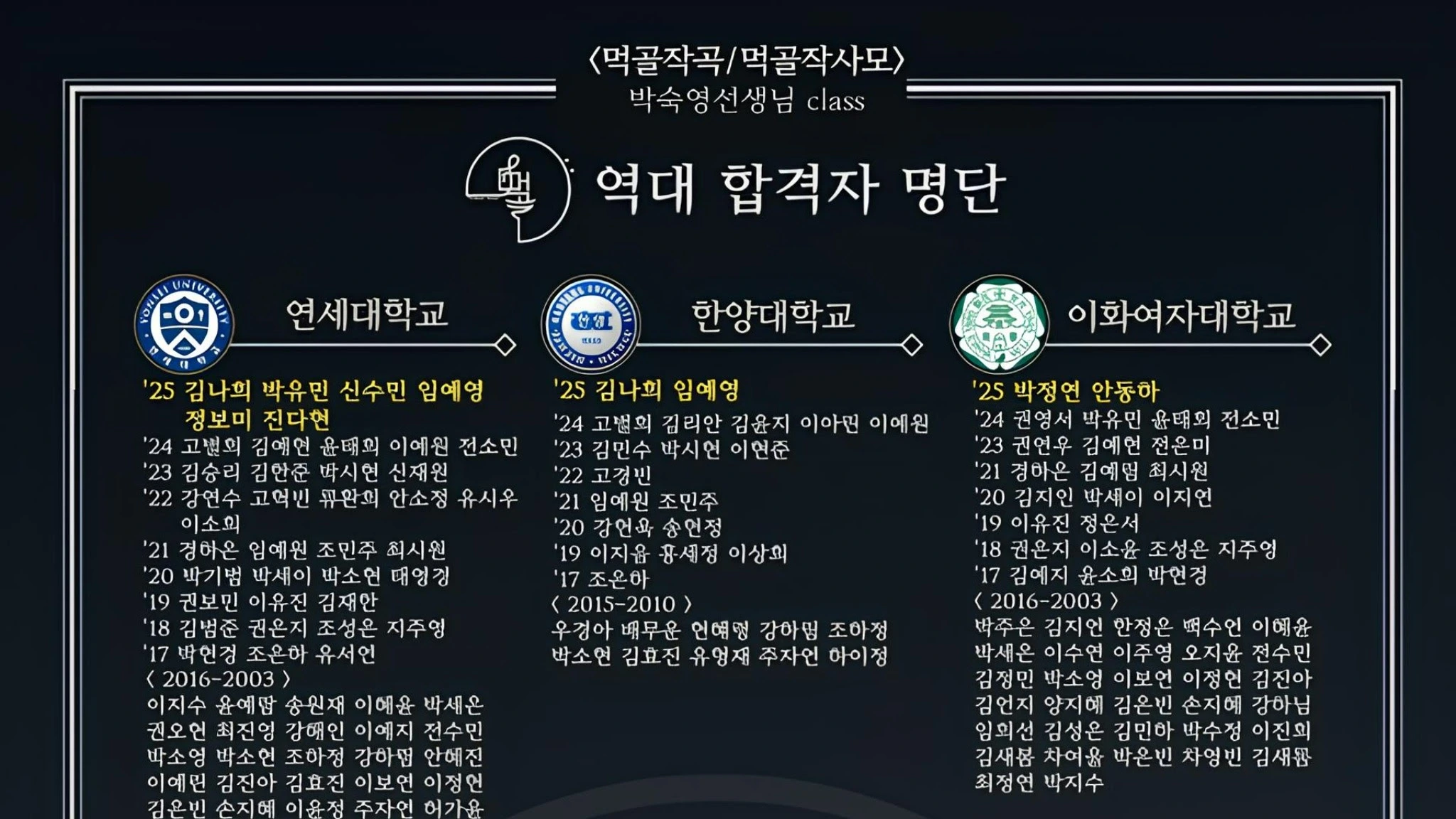 #클래식 작곡 입시 전문 #먹골작곡입시_박숙영클래스 (구 먹골 작사모) #대표선생님: 박숙영 (중계동 레슨실) #작곡과 입시의 팩트는 네이버카페 합격후기에 자세히 안내되어 있습니다 - - - - - - - - - - - - - - - - - - - - - - - - - - - - - - - - - - - - - - - - - #먹골작곡입시-박숙영클래스 역대 합격 (2003학년도~2026학년도 현재) 연세대학교 작곡과 (83명, 12년 연속 합격자 배출) 2026년 5명 합격 (6년 연속 국내 최다합격) 2025년 6명 합격 (5년 연속 국내 최다합격) 2024년 5명 합격 (4년 연속 국내 최다합격, 10년 연속 합격생 배출) 2023년 4명 합격 (3년 연속 국내 최다합격) 2022년 6명 합격 (2년 연속 국내 최다합격) 2021년 4명 합격 (국내 최다합격)