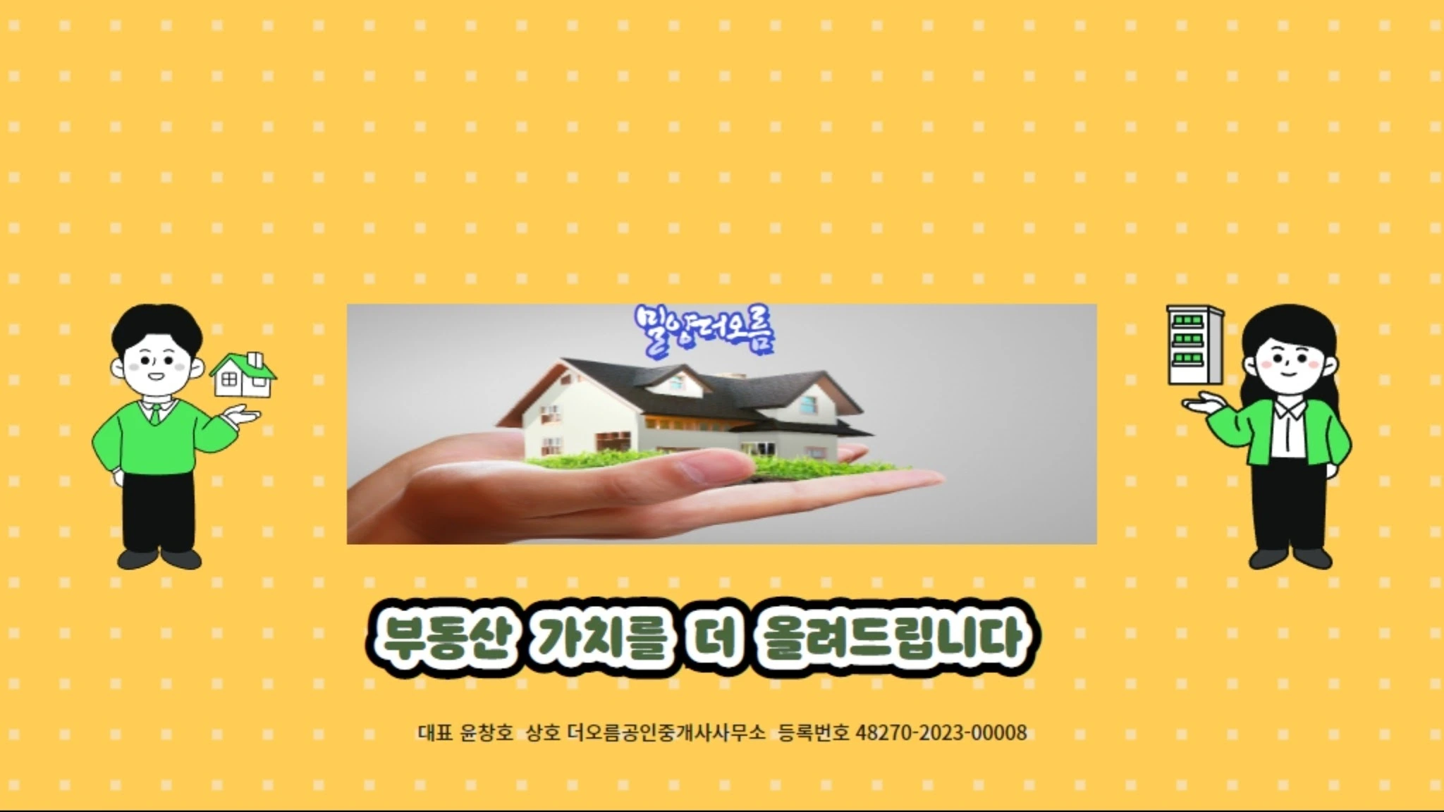 밀양부동산 채널입니다. 밀양전지역 아파트 촌집 전원주택 상가 토지 등의 매물을 소개하고 중개하는곳!!! 항상 성실하고 책임있는 중개와 정직하고 깔끔한 마무리로 찾아뵙겠습니다!! 상호 더오름공인중개사사무소 등록번호 48270-2023-00008 주소 경남 밀양시 밀양대로1782 전화 055-352-1101 대표자 윤창호