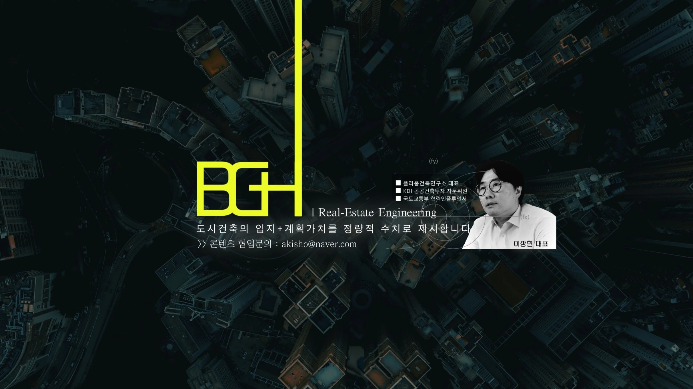 도시와 건물의 입지/계획 요소들을 자산가치 관점에서 분석, 연구, 공유합니다. * 이상현 대표 약력 (現, 한국개발연구원(KDI) 외부연구원) - 홍익대학교 건축대학 건축학과 (서울캠퍼스) 졸업 - Gensler Chicago USA, architecture-intern 근무 - 삼성 삼우종합건축사사무소 초고층/첨단시설 설계담당 - LG HSAd 첨단시설 공간기획담당 (LG사이언스파크 담당) - SK네트웍스 Walkerhill Hotels & Resorts 사업기획실 - (現) 플라폼건축연구소(STUDIO PLAFORM) 대표