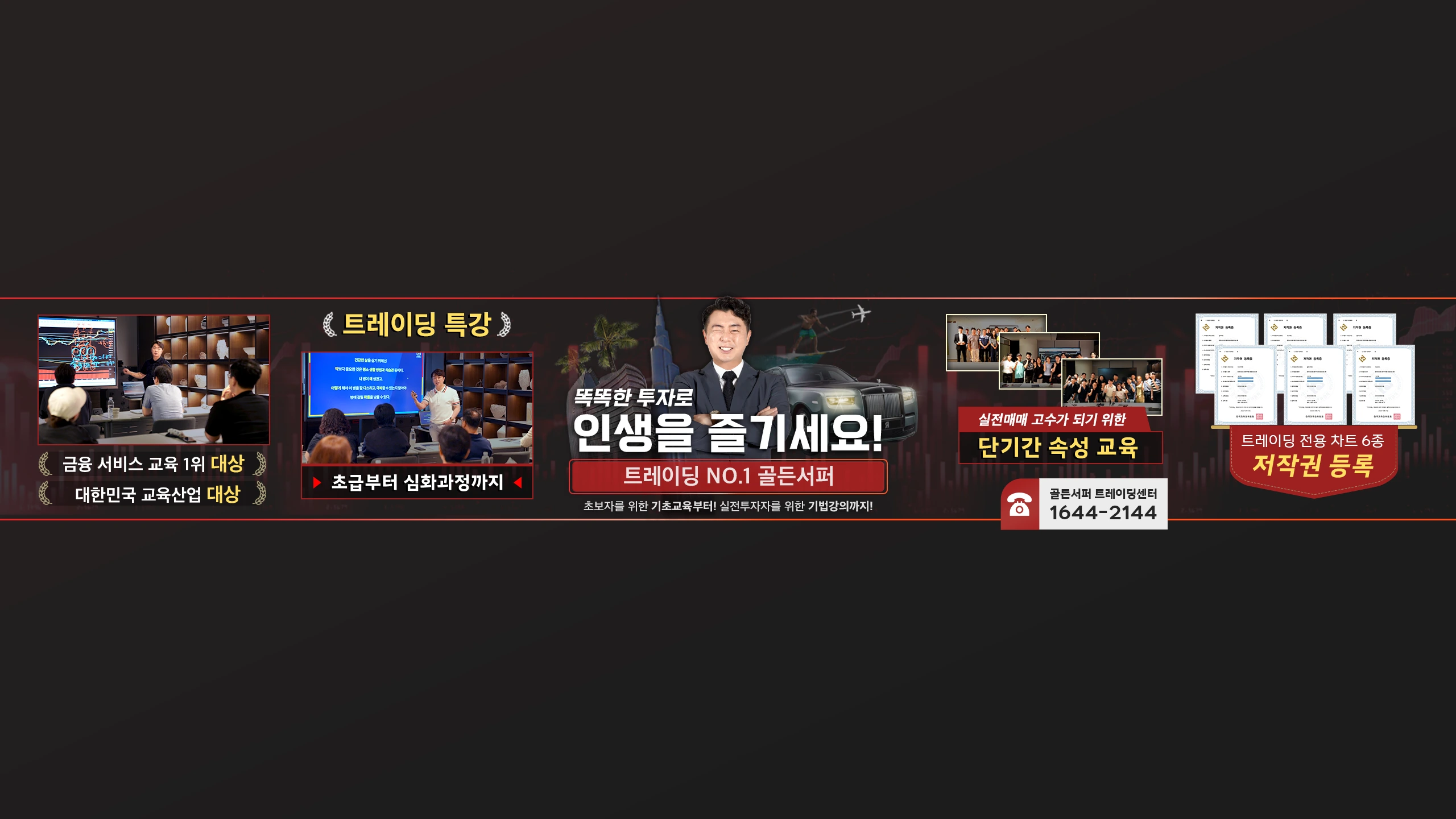 https://www.goldensurfer.co.kr/free 아직까지 무료 교재와 방송 시청을 못하신분들은? 위 링크를 클릭하고 신청해주세요! "내 안의 고수를 끄집어 내자" 안녕하세요. 골든서퍼입니다. 골든서퍼 유튜브는 "재테크" 전문채널입니다. 어렸을적부터 훌륭한 부자가 되는게 꿈이었습니다. 부자의 길로 가는 첫 발걸음을 20살때 적금을 가입하며 시작하게 되었습니다. 적금 이후 펀드→주식, ETF→ELW 워런트→국내선물→옵션→FX마진→해외선물, 부동산 순으로 투자를 하게되었습니다. 여러분들은 저만큼 힘든 시절을 겪지 않았으면 하는 마음에 골든서퍼 유튜브 채널을 개설하여 운영하고 있습니다. 저의 콘텐츠는 제가 투자하며 성공하여 얻어진 노하우, 경험담을 알려드리고자 합니다. 여러분들께서 평소에 궁금한 것들이 있다면 영상 댓글로 남겨주시면 제가 참고하여 콘텐츠를 제작할 예정입니다. 많은 참여와 관심 부탁 드립니다. 감사합니다.