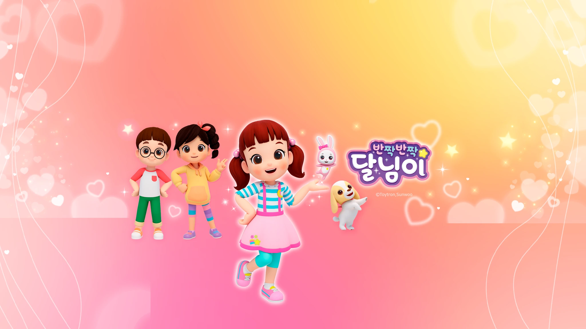 '반짝반짝 달님이'는 밝고 사랑스러운 6살 여자아이 달님이가 가족, 친구들과 겪는 즐거운 일상에 대한 본격 뮤지컬 애니메이션 시리즈입니다. 정이 많고 감수성 풍부한 달님이는 늘 주변에 관심이 많습니다. 케이크 가게를 하시는 아빠, 회사원 엄마, 여동생 달콩이, 유치원 친구 써니와 별이, 거기에 할아버지와 애완견 밀크까지. 사랑하는 이들과 함께 겪어가는 일상 속에서 달님이가 보고 듣고 느끼며 공감하는 이야기들이 매 에피소드 가득 펼쳐집니다. 오늘은 또 어떤 즐거운 일이 우리 달님이에게 일어날까요?
